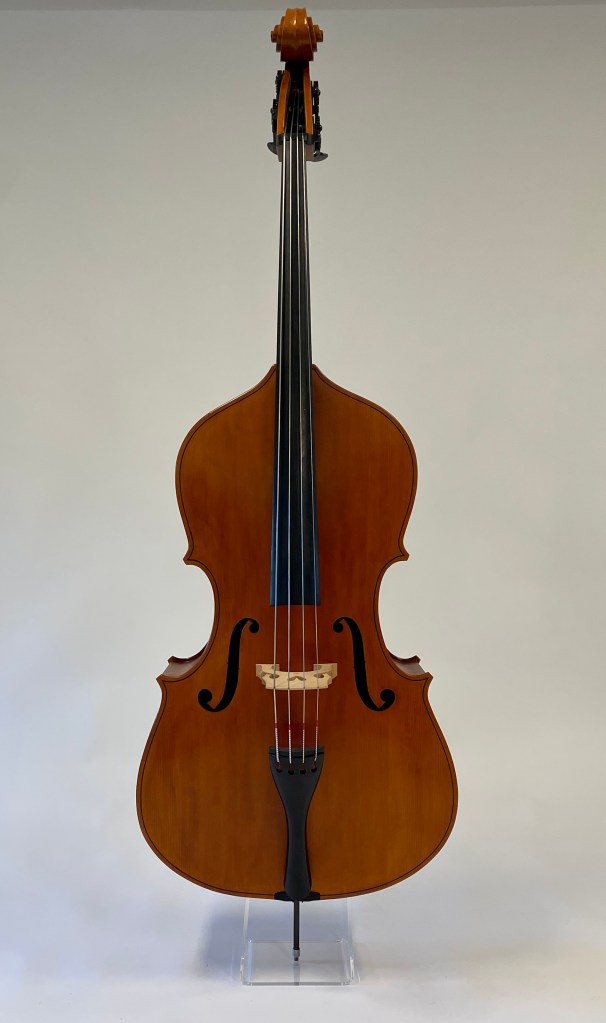 This bass was made in shop by Jacob and is patterned after a Pietro Pallotta instrument from 1795. The back and ribs were constructed from locally sourced poplar. Features include Rubner tuners, a removable neck, and solid black purfling with an ornament at the upper and lower back.
