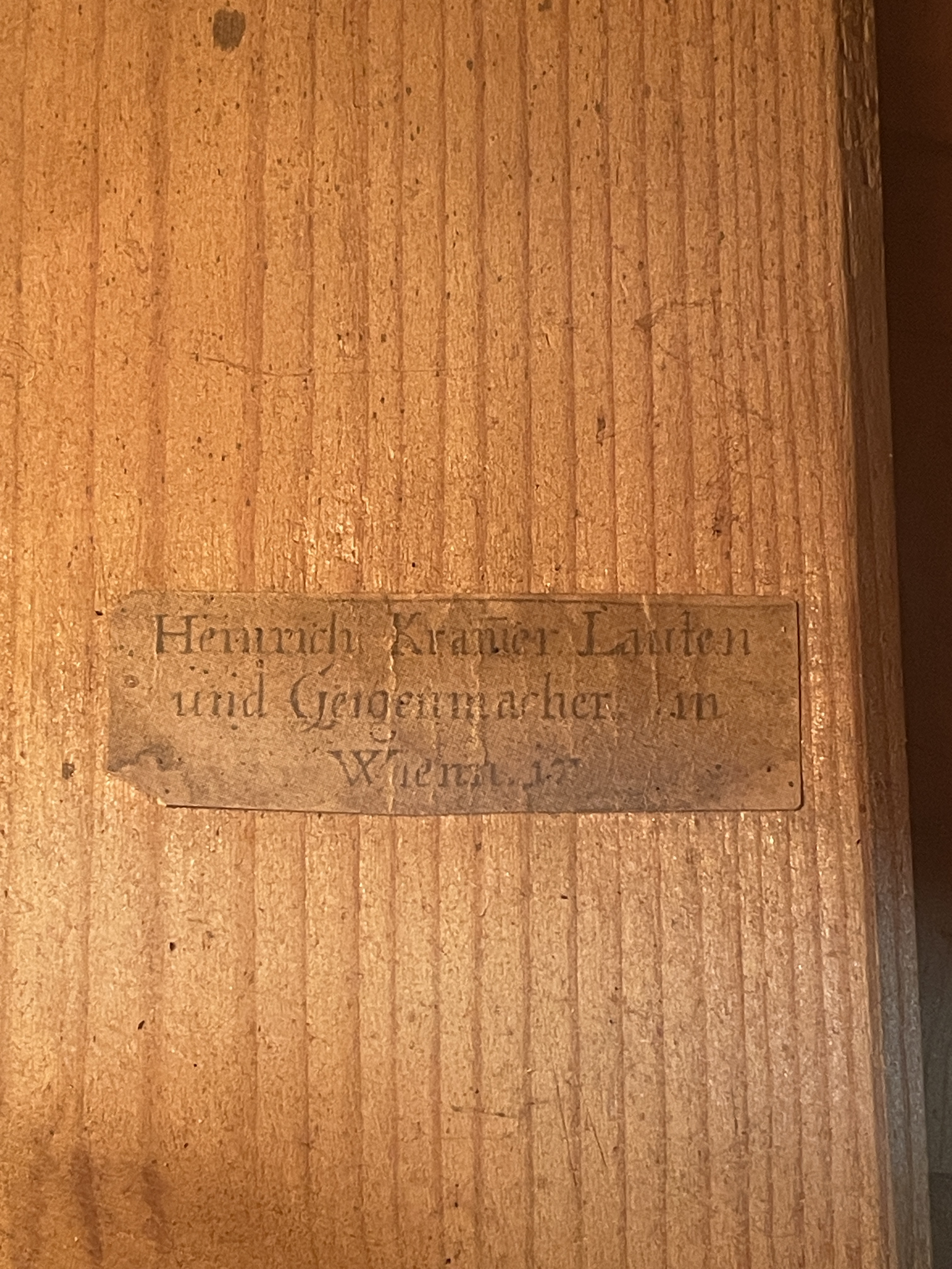 This is potentially a historically important early Viennese bass. Under blacklight a faint (16) can be seen written after 17– on the label. This bass features a deep, dark brown varnish, hatpeg tuners, and a flat back. The slight warp to the pegbox is due to the aging of the wood and not of any structural concern. With its rich, dark, mellow tone, this bass would be perfect as an orchestral or solo instrument. This bass was owned by the late Inez Wyrick.